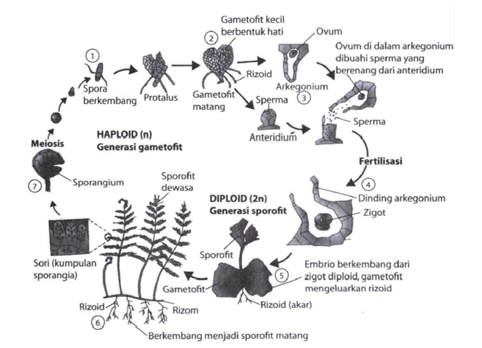 Agar membantu pemahaman kalian, simaklah skema sederhana metagenesis dari pteridophyta di bawah ini: Secara umum, tahapan metagenesis pada tumbuhan paku adalah sebagai berikut : Sehingga, pengertian metagenesis tumbuhan paku dapat dikatakan sebagai daur hidup tumbuhan paku yang terdiri atas dua generasi, yaitu generasi sporofit dan generasi gametofit. Gametofit jenis tumbuhan paku tertentu tidak memilki klorofil sehingga tidak dapat berfotosintesis. Gametofit pada pteridophyta bersifat haploid (n), berkembang dari protalium dan masa hidup pendek. See full list on plantae10.wordpress.com Sporangium terdapat pada sporofit (sporogonium) yang terletak di daun atau di batang. Metagenesis (siklus hidup) pteridophyta mengalami pergantian antara generasi gametofit dan sporofit, berikut jabaran metagenesis pteridophyta: See full list on murid.co.id Reproduksi aseksual dan seksual pada tumbuhan paku terjadi seperti pada lumut. See full list on plantae10.wordpress.com See full list on plantae10.wordpress.com Generasi sporofit pada tumbuhan paku terdapat pada siklus hidup tumbuhan paku aseksual.